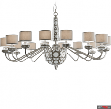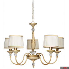 Люстра Le Porcellane TARSIA из Италии. Центральная часть светильника окрашена в черный цвет с геометрическим узором контрастного оттенка. Рожки сделаны из окрашенной латуни, а абажуры из прозрачной органзы с золотистым кантом.