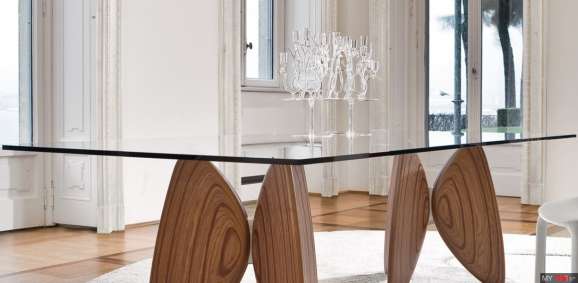 Обеденный стол Bonaldo Vanessa в современном стиле из Италии. Усовершенствованный в деталях и использовании материалов, Vanessa - это фиксированный стол, характеризующийся прозрачной стеклянной крышкой, имеющей различные формы и размеры; ножки напоминают своей формой бабочку, сделаны из многослойного дерева цвета ореха.