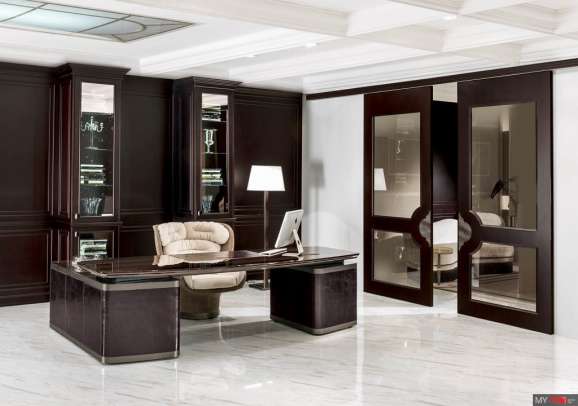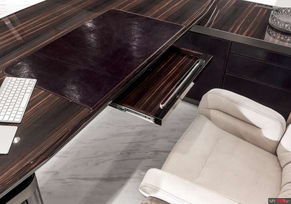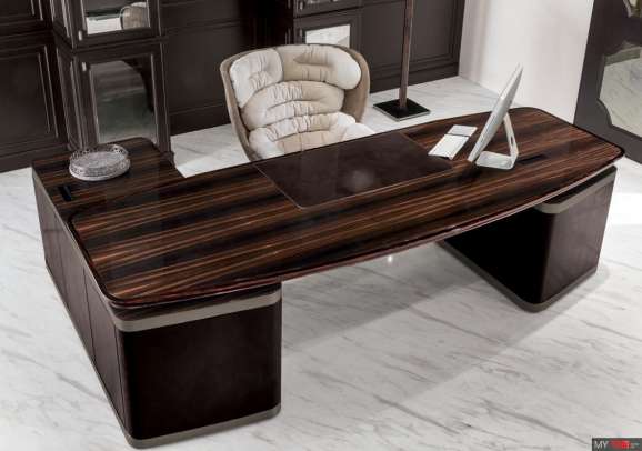 Письменный стол Longhi Ector в классическом стиле из Италии. Деревянный стол в отделке из полированного эбенового дерева, глянцевый орех Canaletto, матовое черное дерево или матовый орех Canaletto, охарактеризованный твердой деревянной кромкой. Верх с вставкой из образца кожи и съемным мини-лотком. База имеет две доступные композиции: A - два выдвижных ящика, расположенных в конце верха, B - комод и полуостров с 2 дверьми и 4 ящиками. Деревянный комод, покрытый кожаной категорией образцов и краями в выпрямленном металле в отделке: яркое светлое золото, матовое золото шампанского, яркий хром, ярко-черный хром, матовая сатиновая бронза.