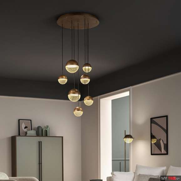 Подвесной светильник Masiero Iglu S7 - это интуиция, рожденная из наблюдения за совершенством сферы, преобразованная в совершенную, узнаваемую и уникальную форму сетки, которая, вместо того, чтобы препятствовать, создает узор света и тени, превращая металл в светящийся драгоценный камень.