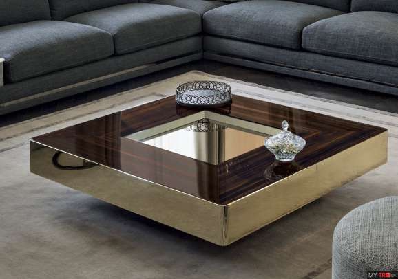 Столик Longhi Lord в классическом стиле из Италии. Журнальный столик с центральным лотком, покрытым бронзовым и копченым зеркалом. Верхняя отделка: глянцевое эбеновое дерево, глянцевый орех Canaletto, матовое черное дерево, матовый орех Canaletto, глянцевая лакированная слоновая кость, матовый венге, обитый кожей в цветах образцов. Наружная полоса покрыта стеганой кожей P.3 кат. Suede и Lusso или P.9 cat. Набук или в металлическом грунте в отделке: яркое светлое золото, матовое золото шампанского, яркий хром, ярко-черный хром, матовая сатиновая бронза.