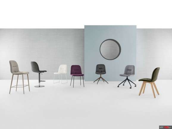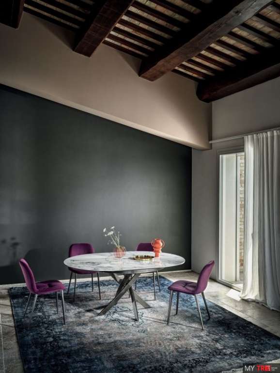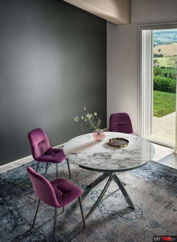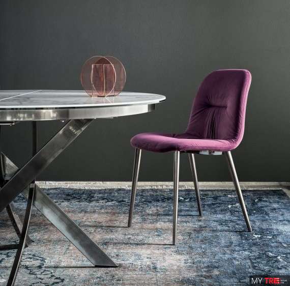 Стул Bontempi Casa Chantal с металлическим каркасом конического сечения. Обивка и обивка из эко кожи, эко кожи Premium, технического бархата, ткани Mambo и Lulù, водонепроницаемого нубука, чистой натуральной шерсти, бархата, ткани Decò, ткани Kvadrat Field, ткани Coda и кожи Premium.