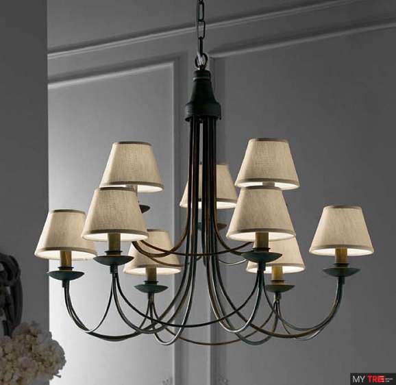 Люстра Eurolampart 0047/09LA в класичному стилі з Італії. Масивна кована люстра має виглядати важко, проте завдяки світлим абажурам тканини вона виглядає повітряною, практично невагомою. Дев`ять лампочок дають багато світла, тому має сенс розмістити цю красу у великому приміщенні, наприклад, у вітальні або у холі готелю.