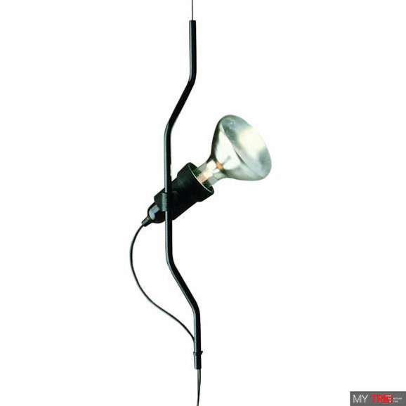 Підвіс Flos F5700035 у сучасному стилі з Італії. Лампа забезпечує пряме світло. Лампа переміщається вертикально через ковзну пофарбовану або нікельовану сталеву трубку на сталевому стальному тросі (довжиною 4000 мм). Головка приладу з литого під тиском чорного еластомеру з перемикачем. Довжина шнура живлення від тримача лампи 4000 мм. Вага нетто 3 кг.